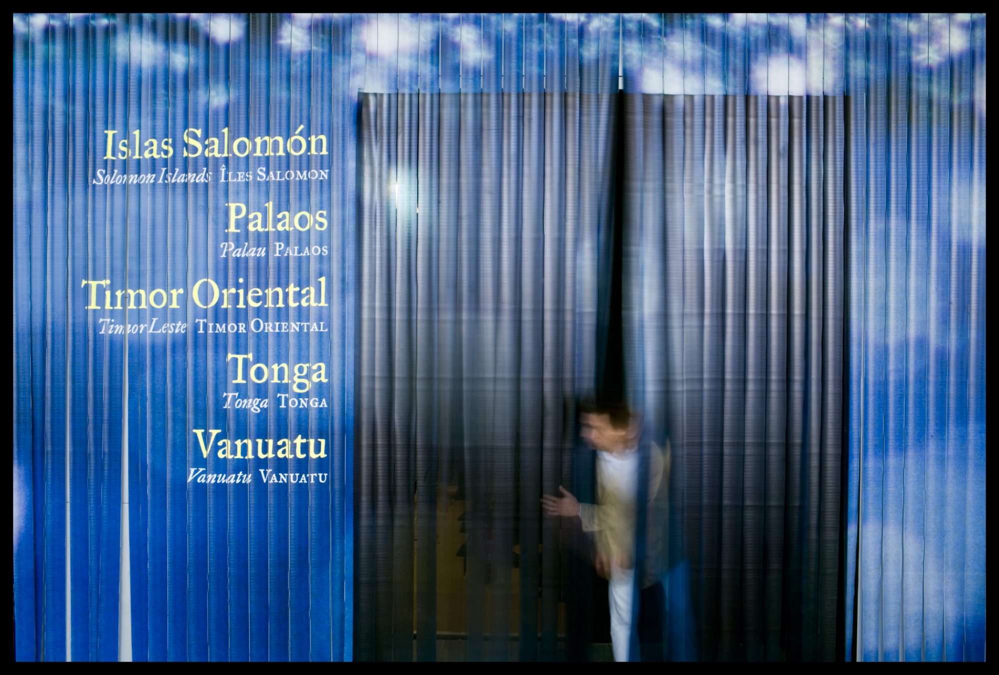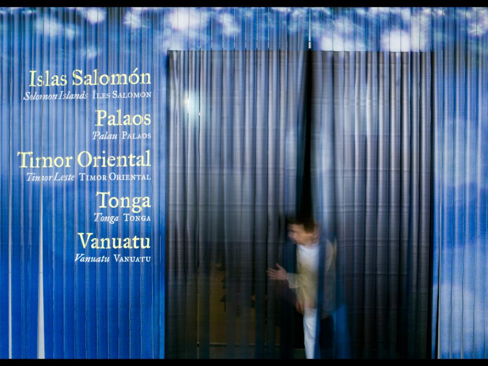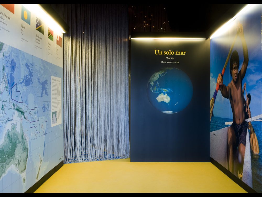 Las paredes del pabellón exhiben una variedad de ejemplos relacionados con la cultura del agua de cada uno de los países participantes: el cráter volcánico de la isla de Tofua en Tonga, un extraordinario contenedor natural para recoger el agua de lluvia; el antiguo lago Siwi sobre las cenizas del volcán Monte Yasur en Vanuatu; el reciente traslado de la capital de Palau a la isla de Babeldaob, a orillas del lago Ngardok; los estanques de agua dulce de las plantaciones de arroz de Timor Oriental; y las tranquilas aguas de la laguna Marovo en las Islas Salomón, que como caldo de cultivo de cinco idiomas diferentes ilustra la rica diversidad de las Islas del Pacífico.