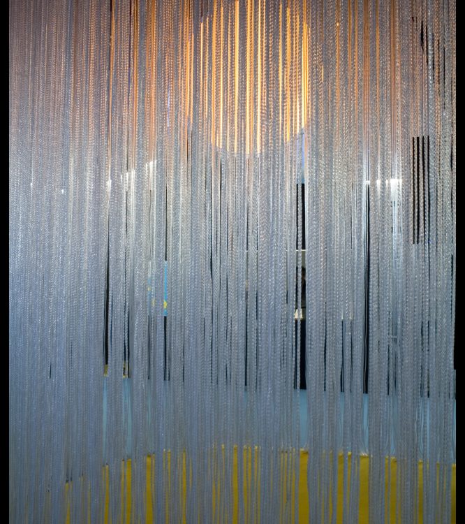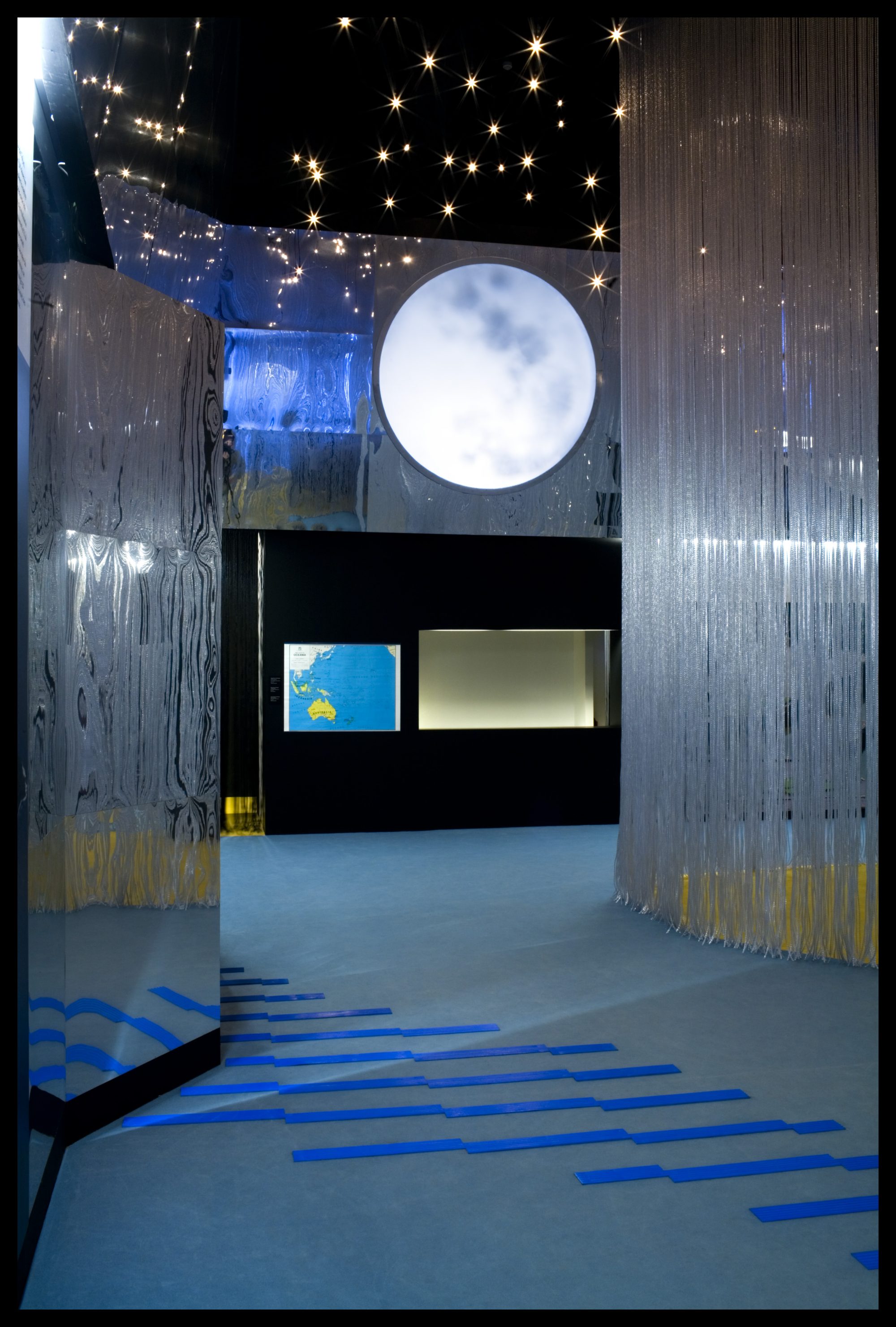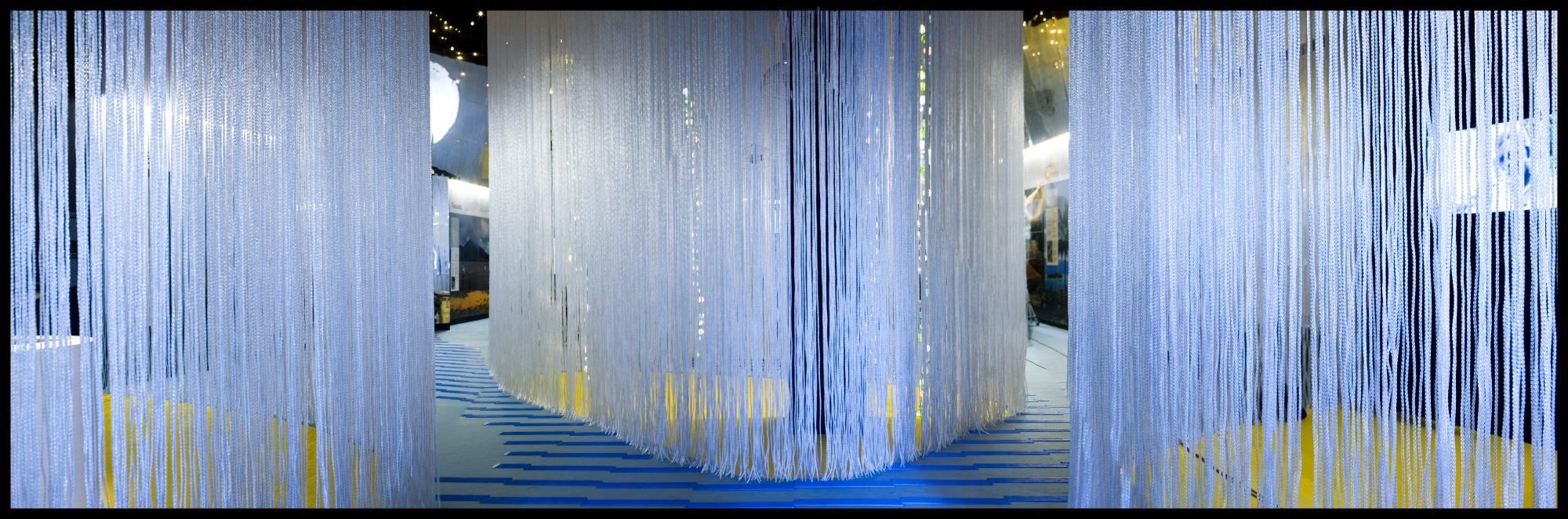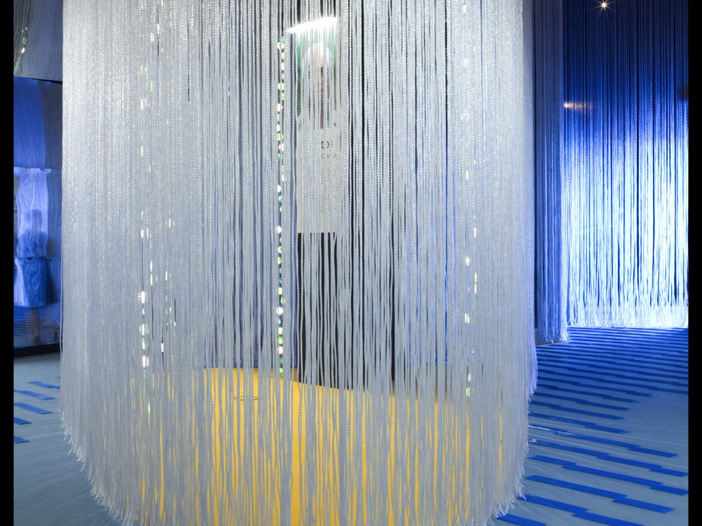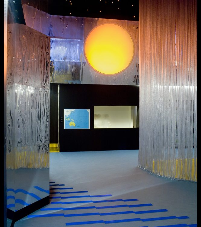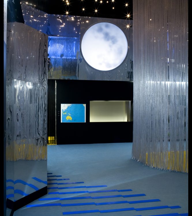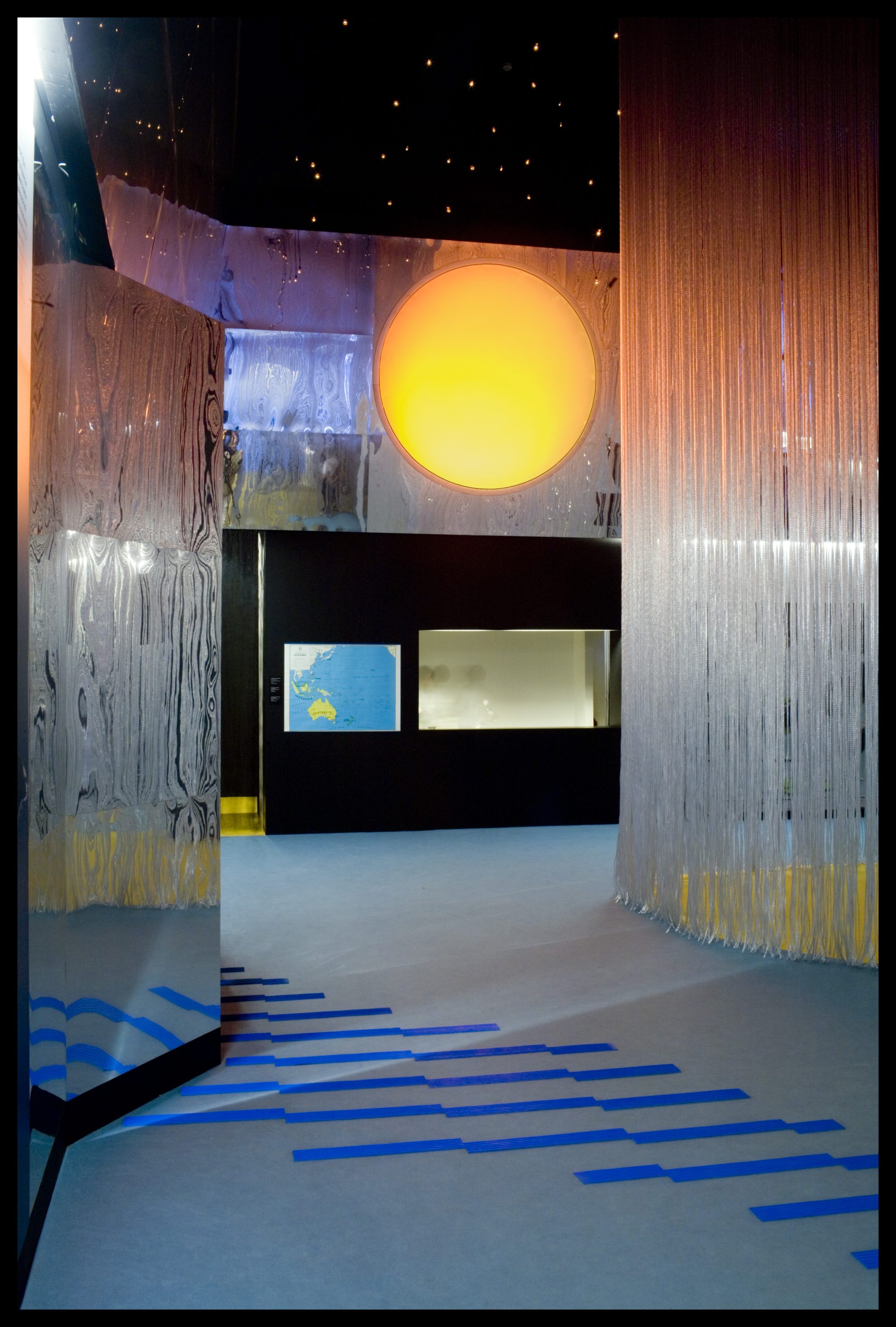 A continuación, los visitantes acceden a un espacio que recrea el mar bajo un cielo estrellado. Al fondo, un gran cuerpo celeste alterna entre el sol y la luna. La iluminación reproduce la noche y el día en un único espacio rodeado por un horizonte lejano que separa el cielo y el mar. En el interior, cortinas con flecos traslúcidos unen lo que separa el horizonte, como en una atmósfera oceánica húmeda.